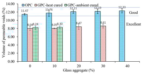 - The porosity of the OPC concrete and geopolymer concrete slightly increased due to the increase in the glass aggregate. Furthermore, for the same glass aggregate content, the geopolymer concrete provided a lower porosity compared to the OPC concrete.