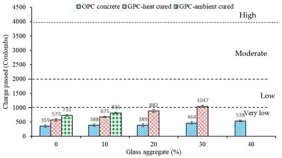 - The increase in the chloride permeability of the OPC concrete and geopolymer concrete due to the increase in the glass aggregate was ascribed to the increase in the porosity of the concrete. For the same glass aggregate content, the geopolymer concrete provided a higher chloride permeability compared to the OPC concrete due to the higher pore solution conductivity of the geopolymer concrete than the OPC concrete.