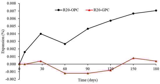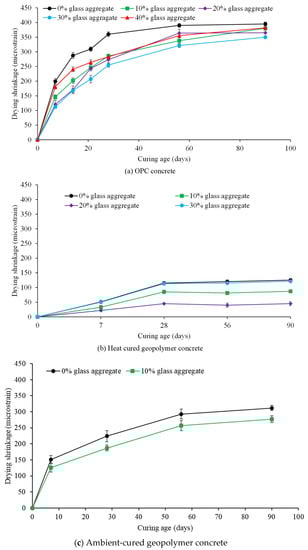- The drying shrinkage of the OPC concrete and the geopolymer concrete decreased when using a glass coarse aggregate due to the low water absorption of the glass coarse aggregate. Furthermore, as high curing temperatures decreased the evaporable water and developed a dense matrix, the heat-cured geopolymer concrete provided a lower drying shrinkage than the corresponding OPC concrete and ambient-cured geopolymer concrete. Furthermore, the 6-month expansion of the OPC and geopolymer concretes using a 20% glass aggregate during the ASR test were 0.007% and 0.0004%, respectively.