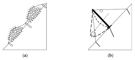 In passive flexible protection systems and flexible rock sheds (Figure 2b), the net is subjected to typical dynamic impact loads during arresting rockfalls. The deformation ability of the net basically determines its buffering capacity. Peila et al. [] designed and carried out the full scale impact test of the passive protective net and studied the impact mechanical response of the protective net system under different impact energy. Gerber et al. [] carried out an impact test of a 250 kJ–3000 kJ passive protective net and found that, with the increase of impact energy, the maximum impact deformation and residual deformation of the mesh increased in a logarithmic function, and the increase was not obvious after the impact energy reached 2000 kJ. Tan et al. [] compared the deformation and impact force of flexible and rigid structures under the same impact condition and found that the impact duration of flexible structures increased to 4–8 times that of rigid structures, and the impact force of flexible structures decreased more than 50% compared to rigid structures. Buzzi et al. [,] carried out impact tests in a self-designed vertical rockfall impact test frame and analyzed the failure types of the net under rock impact with different sizes and shapes, and then they revealed the influence of rock size on the energy dissipation capacity of the net. Yu et al. [] found that the number of steel wire strands and boundary constraints influenced the impact deformation of the net, but the deformation remained relatively stable at about 30–40% of the system deformation. Koo et al. [] compared the dynamic impact response of a flexible net subjected to the impact of sphere-shaped blocks and flat plate blocks and found that the deformation was significantly reduced under flat plate block impact. Qi et al. [] expanded and analyzed the impact of the falling rock rotation on a passive protection system through numerical simulation. It was found that, as the ratio of rotational kinetic energy to translational kinetic energy increases, the net deformation decreases.