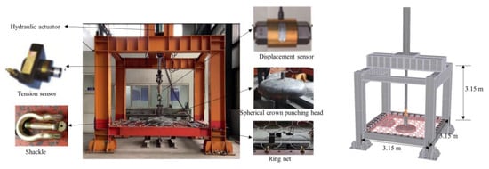 The test equipment adopted in the static punching test comprised a punching test frame, spherical crown punching head, connecting shackle, displacement sensor, tension sensor, and hydraulic actuator (Figure 3). Positioning holes were located around the base beam and were used to connect the net to the punching test frame by shackles. The size of the ring net was 3 m × 3 m. The diameter of the bottom surface of the spherical crown punching head was 1 m, which was placed directly below the center of the fixed flexible ring net and connected with a plate hinge pin. A tension sensor and a displacement sensor were used to collect the force and deformation synchronously.