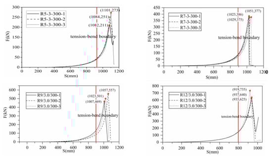 After the test started, the ring net began to tighten as the punching head was lifted, leading to the relative sliding between the rings and tension development. With further loading, the ring net began to deform. Bending deformation progressed to tensile deformation until the ring net reached the limit state. The central rings that had direct contact with the loading head changed from a perfect circle to an ellipse and finally a trapezoid. The rings, which were directly connected to the boundary shackles, converted the perfect circle into an ellipse and finally a triangle. The middle rings were transformed from a perfect circle to an ellipse and finally a rectangle (Figure 4). The overall ring net was in the shape of an inverted “V.” Loading continued until the ring net broke. The shape of the net after breaking is presented in Figure 4c. The failure position was located at the edge of the punching head. Figure 5 shows the force-displacement curves of ring nets with diverse specifications obtained in the test, with the position of 85% of total deformation approximated as the boundary state of net breakage.