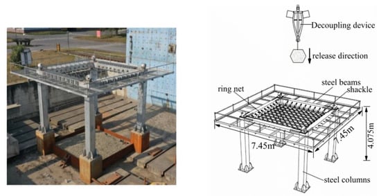 The dynamic impact test frame was a rigid frame composed of steel columns and steel beams placed on concrete columns. The main part of the frame was composed of four steel columns and four steel beams. The drop weight was 0.76 t and 0.8 m in diameter. The size of the ring net was 3.9 × 3.9 m. The ring net was attached to the steel beams by surrounding shackle connectors (Figure 6).