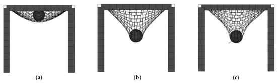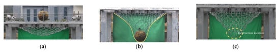 Ring net deformation process in the dynamic impact test: (a) ring net relaxation state; (b) ring net deformation; (c) ring net breakage.