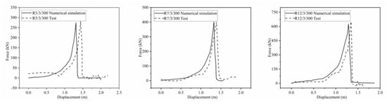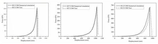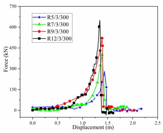 Before the drop weight touched the ring net, the ring net was in a natural state of relaxation. After the drop weight touched the net, the ring net began to tighten and finally break. Before the block penetrated the net, the ring net was in a “V” shape (Figure 7), the shape of the rings at the impact area was approximately rectangular, and the shape of the rings connected with the shackle changed to a triangle shape. The force-displacement curves of the drop weight are illustrated in Figure 8. When time t = 0 s, the drop weight contacted the net. The residual kinetic energy of the drop weight at the moment of mesh breakage was subtracted from the total impact energy to obtain the maximum impact energy that the net could withstand. The ring net breaking force and breaking displacement under different specifications are shown in Table 4. With the increase in the ring net winding number from 5 to 12, the ring net breaking displacement decreased by 9.72%, the ring net breaking force increased by 131.08%, and the ring net energy dissipation increased by 183.98%.
