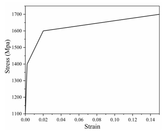 Plastic deformation and ring net failure can be expected during the test process. Thus, segmented nonlinear material was used to describe the ring material in the finite element simulation. The stress–strain curve is illustrated in Figure 10 [], and the criterion for failure was 1770 Mpa of tensile stress []. For the numerical model of the main components, please refer to papers about the flexible rockfall barrier by Zhao et al. [], Xu et al. [], and Qi et al. []. In order to guarantee the correct stiffness and mass of the net, an equivalent cross-section radius was employed, as given by []: