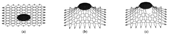 Ring net deformation process in the static punching test: (a) ring net relaxation state; (b) ring net deformation; (c) ring net breakage.