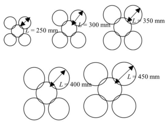 Keeping the net size, net specification, punching head diameter, and rockfall diameter the same as the parameters in the analysis of rockfall impact velocity, we established models with ring diameters of 250 mm, 300 mm, 350 mm, 400 mm, and 450 mm. The distribution of the equivalent coefficients is shown in Figure 16.
