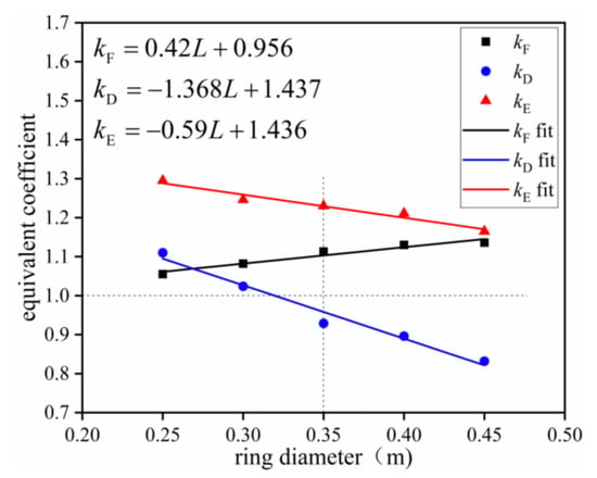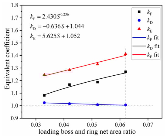 Figure 21 indicates the equivalent coefficient curves of different ratios of loading head area to ring net area. With an increase in the loading head area to ring net area ratio, kF increased from 1.082 to 1.270 (an increase of 17.4%), kD decreased from 1.024 to 1.006, (a reduction of 1.7%), and kE gradually increased from 1.246 to 1.412 (an increase of 13.3%). These findings were attributed to the decrease in the diameter of the falling rock and the “bullet effect” produced by the dynamic impact of the falling rock. At the same kinetic energy, the impact force on the ring net closest to the impact center point of the falling rock increased. The impact force then decreased as the distance from the center point increased. Falling rocks with small diameters impact at a higher speed than falling rocks with larger diameters, causing rings in the local area of impact to be broken first. At the same time, rings outside this area fail to function in energy dissipation, thus affecting the overall energy dissipation performance of the ring net. In contrast, the larger the diameter of the falling rock, the larger the contact area with the surface of the ring net. Under these conditions, the axial force on the rings at the center of the impact of the rockfall is reduced, which delays the failure time to a ring net failure. The impact force on the ring net increased following an increase in the diameter of the falling rock. These findings indicate that, when both kF and kE are greater than 1, breaking force and net energy consumption values obtained in static tests will be less than those found in dynamic tests. In addition, the breaking displacement obtained in force tests will be greater than that in dynamic tests.