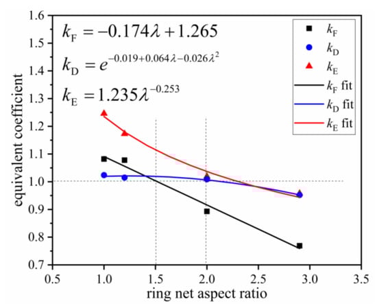 - With an increase in ring net aspect ratio, the equivalent coefficient of ring net breaking force decreased linearly. The exponential function of the equivalent coefficient of tensile displacement also decreased, and the equivalent coefficient of ring net energy consumption decreased as a power function. When the aspect ratio is higher than 2, the breaking force, the breaking displacement, and the energy consumption of the mesh under static punching test will be larger than those under the dynamic impact test.