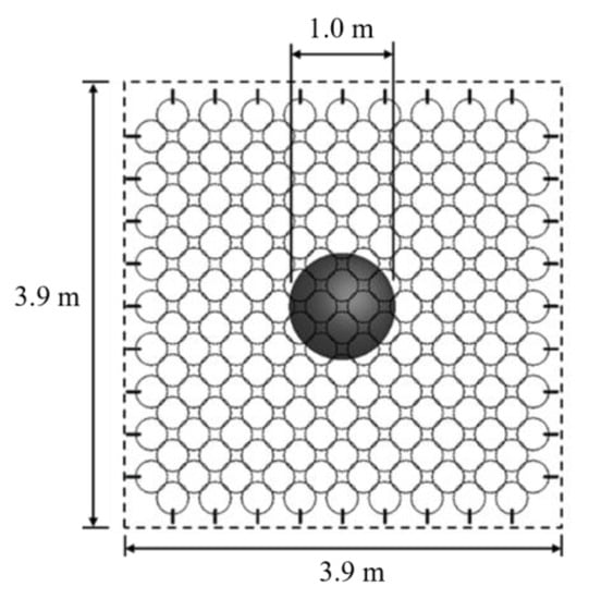 A steel wire ring net with the characteristic of flexibility and high strength is an important intercept component of flexible protection systems for rockfall mitigation (Figure 1). The net is formed by multiple rings loosely connected []. A single ring is usually made of steel wire with a diameter of 3 mm and a tensile strength of 1770 Mpa, which is wound with different numbers of turns and fixed with buckles.