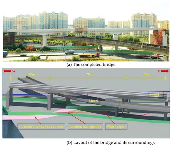 Figure 2 presents the cross section of the U-shaped single-box double-cell concrete box beams. The constructed project is located in a complex environment. Metro Line 6 passes diagonally across the constructed bridge [