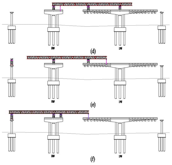 Figure 7f. The auxiliary leg is then anchored. Moreover, the front leg is hung on the main truss girder and moved and anchored on section 0# of the western half of the bridge. Finally, the auxiliary leg is dismantled after the stage is completed.