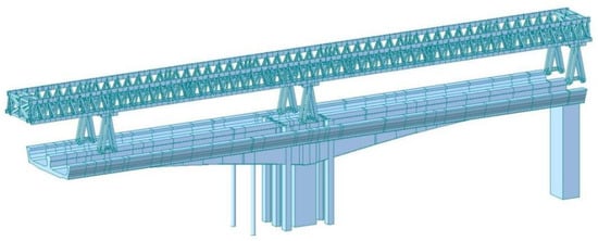 The construction stages of the entire bridge are simulated using MIDAS/CIVIL 2019. The impact of the bridge erection machine and the bridge structure is considered in the modeling. A rigid connection is set between the bottom of the bridge erection machine leg and the upper structure of the bridge. The beam and the bridge pier, as well as the main truss and the leg, are rigidly connected. The weight of the Phase II constant load is added to the unit load applied to the bridge.