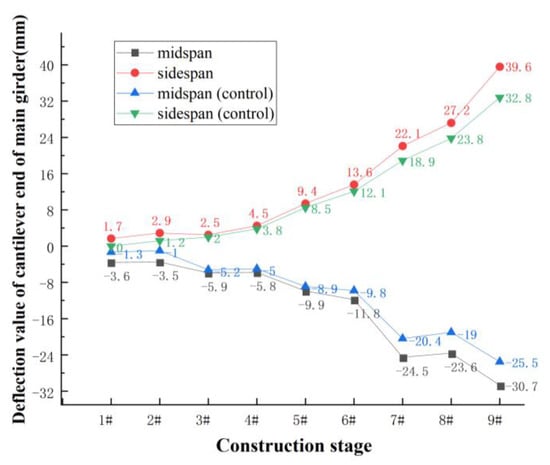 With the progress of the construction stage, the cantilever tip deflection of the side-span beam and the mid-span beam is constantly increased. When section 9# is hoisted, the cantilever tip deflection value of the side-span beam reaches 39.6 mm. After performing the control method of the mechanical state, the cantilever beam tip deflection is reduced to 32.8 mm. Similarly, the deflection value of the cantilever tip of the beam on the mid-span also decreases after being controlled. Therefore, it can be concluded that the previously mentioned mechanical state control methods can efficiently reduce the cantilever beam tip deflection.
