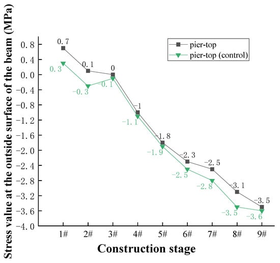 Figure 13 presents the stress value at the outside surface of section 0# during the hoisting stage. When sections 1# and 2# are hoisted, the surface of section 0# shows a tensile stress. An excessive tensile stress will cause a surface concrete cracking of section 0#. After the internal force is adjusted and controlled using the mechanical state control method, the stress at the surface of the beam is reduced. The maximum tensile stress is then 0.7 MPa when section 1# is hoisted. Therefore, this shows that the mechanical state control method can reduce the tensile stress on the surface of section 0# during the construction stage.