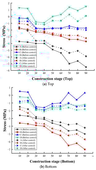 Table 1 that the stress is negative on side D, which indicates that side D is the most dangerous place in the construction process. A tensile stress appears when hoisting sections 1#, 2#, 6#, 7#, 8#, and 9#. The tensile stress decreases (or a compressive stress also appears), when the mechanical state control method is used. This demonstrates that the mechanical state control method has well controlled the stress of the compressive column.