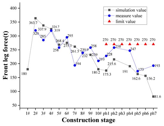 Figure 17 presents the measured value of the reaction force. The reaction force is determined by the pressure ring sensor set at the bottom of the front leg. The FEM results demonstrate that in the hoisting stage of section 2#, the maximum vertical reaction force of the front leg is 363.7 t. As for the construction monitoring results, in the hoisting stage of section 2#, the maximum vertical reaction force of the front leg is 320 tons. In the hole passing stage, the FEM modeling results demonstrate that the maximum vertical reaction force of the front leg is 215.6 tons when passing hole 2. The actual monitoring results of the construction demonstrate that the maximum vertical reaction force of the front leg is 258 tons. Therefore, the actual measurement results are consistent with the simulation results.