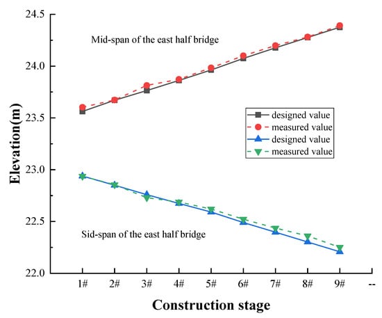 Table 1 shows the calculation difference between the designed value and the measured value. When section 8# is hoisted, the maximum difference between the design value and the actual measurement value is 0.262%. Therefore, it can be concluded that a small difference exists, which meets the design and subsequent construction requirements.