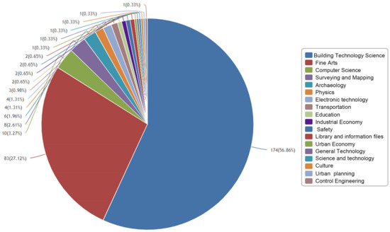 Figure 3. The category of building technology science has the largest number of papers, accounting for 56.86% of all papers, which is related to the disciplinary affiliation of ancient architecture. This is followed by 27.12% of the studies in the category of fine arts. The above two account for more than 80%. Far less than the first two and in the next place are surveying and mapping with 3.27%, computer science with 2.61%, and archaeology with 1.96% in fifth place.