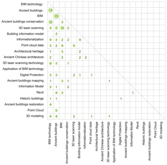 Figure 12, the colors of most nodes are blue-green and green, indicating that most keywords appeared in 2017–2019 on average, which also indicates that these years are a period of rapid development in this field. With the digital development of the architectural heritage conservation industry, 3D laser scanning, point clouds, and BIM are hot topics, and emerging technologies such as 3D laser scanning technology, point cloud data use, and Revit modeling have been widely applied. The yellow nodes in