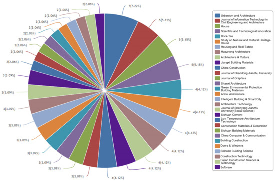 By analyzing the number and distribution of published journals, the degree of attention paid to this topic by core journals in the field of “BIM” and “architectural heritage” research in China can be revealed. By analyzing the distribution of the 186 articles on the China Knowledge Network, the most published journal related to the topic of “BIM” and “architectural heritage” from 2007 to 2022 is “