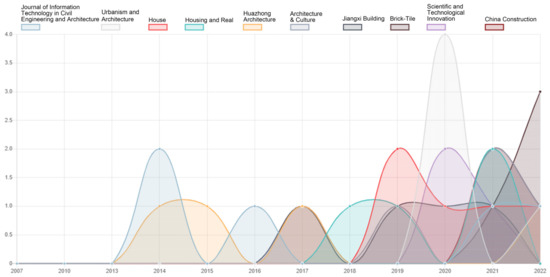 Science and Technology Innovation”, which are tied for the first number of studies published, both entered “BIM” and “architectural heritage”. The top ten journals are basically from the top of the list. The top ten journals basically started in 2013, and their annual publication volume was not high, but showed a gradually increasing trend after 2018. Other journals have not shown significant fluctuations in the thematic literature distribution, which suggests that there is a lack of journals that focus on this field consistently.