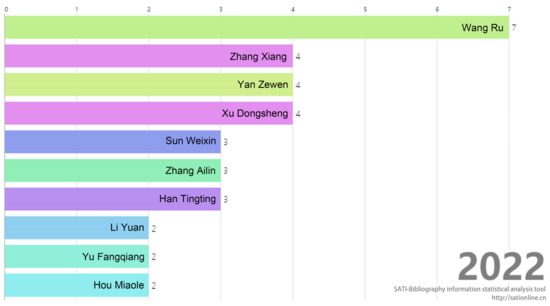 Figure 7, namely, Wang Ru published seven articles, Zhang Jian, Yan Zewen, and Xu Dongsheng published four academic articles, and Sun Weixin, Zhang Ailin, Xu Dongsheng, Li Yuan, Wang Yanmin and Han Tingting published three articles, respectively.