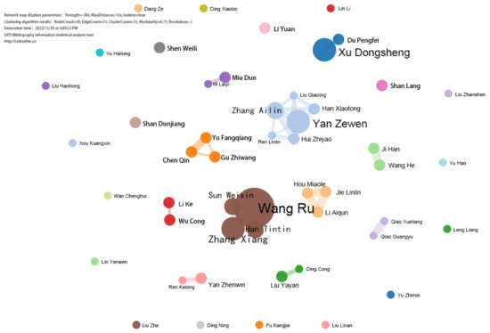 Figure 8. The larger the nodes in the figure, the more papers published by the authors; the connecting lines between the nodes represent the cooperation between authors; the thickness of the lines indicates the closeness of the cooperation between the authors.