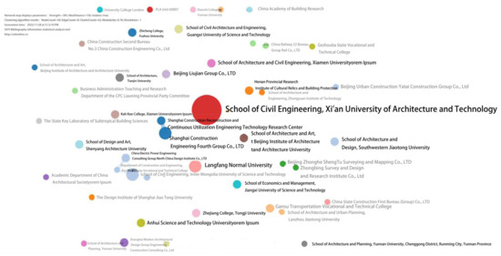 Using SATI analysis software, the 167 articles on “BIM” and “architectural heritage” from 2007 to November 2022 have been analyzed for the co-occurrence of cooperative institutions. The larger the node, the more articles published by the research institution in the field, and the larger the line treaty between the nodes, the greater the cooperation intensity between the institutions. The