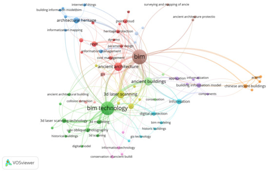 Network visualization of keyword for “BIM” and “architectural heritage” from the 2007 to 2022, created by VOSviewer.