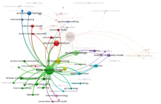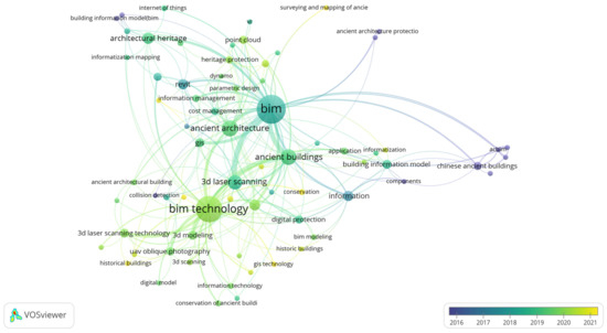 The time superposition map can reflect the research hotspot of each year, and also help to reveal future research and development trend of this field. The superimposed network diagram of BIM and architectural heritage keywords generated by VOSviewer software is shown in