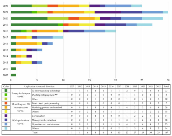 Trend of the number of papers on “BIM” and “architectural heritage” published in various journals from 2007 to 2022 (167 papers).