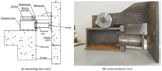Eight RC façade panels were produced for this study, made of concrete with an average compressive strength, MPa. Static tests conducted on the 16 mm diameter rebars yielded the following material parameters: GPa, MPa and MPa. Table 1 shows the most important mechanical characteristics of the steel tubes as illustrated in Figure 1, the EAC comprises the connector body, fixed to the protected structure, a sliding part attached to the façade panel and a kernel element to absorb energy, exploiting the external inversion mechanism of the steel tubes) used to manufacture the core element of the EACs (inverters), i.e., Young modulus , yield stress , tensile stress , inverter steady force , and available stroke .