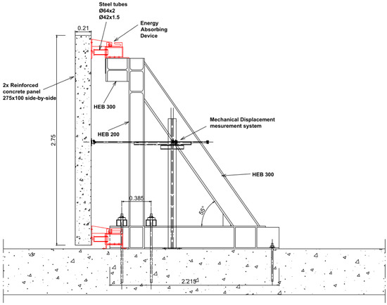 The test setup replicates a typical service situation in which vertical façade sacrificial panels are connected through EACs to a building (represented here by a steel reaction structure, see Figure 2, Figure 3 and Figure 4. The testing infrastructure was set up at the National Institute of Aerospace Technology/INTA Campus “La Marañosa” Testing Centre (INTA/La Marañosa), located in San Martín de la Vega, Madrid, Spain.