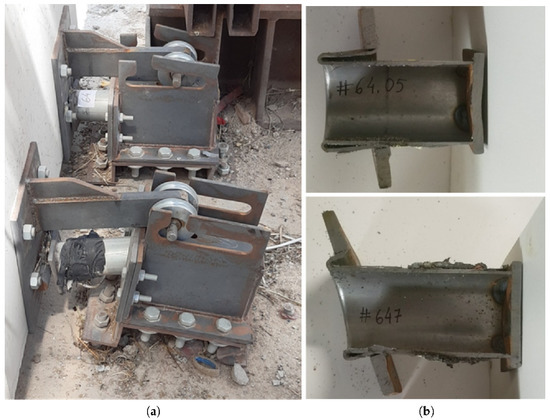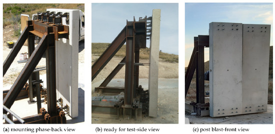 Two reaction structures (setups 2 and 4 in Figure 2) placed face-to-face at 5 m from the explosive charge were used to carry out this research. Each of them supports two identical RC panels ( 0.21 m), which means that four panels with the same size and reinforcement pattern were tested simultaneously. One of the panels is connected to the supporting frame using rigid connectors (the left panel in Figure 4c and Figure 5b), while the others are connected through four EACs (Figure 4a,b and Figure 5a).