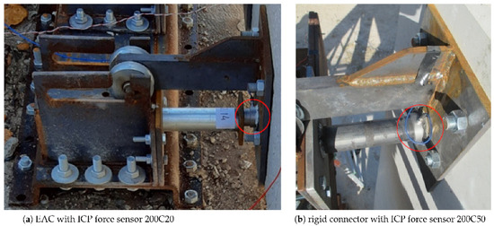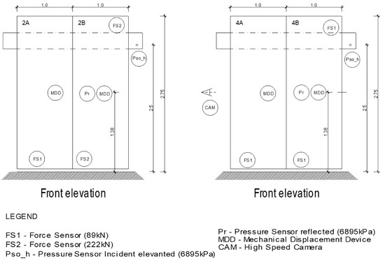 The incident overpressures were measured using general purpose 113B24 PCB piezoelectric crystals pressure gauges with a measurement range up to 6895 kPa and a sensitivity of 0.725 mV/kPa, placed respectively on the ground and at 2.5 m high at a distance of 5 m from the center of the charge (Figure 3 and Figure 7). ICP force sensors were placed in strategic locations to assess the forces transmitted to the supports and further evaluate the effectiveness of the EACs: four 200C20 sensors with a sensitivity of 56.2 mV/kN (±15%) and a measurement range up to 88.96 kN to instrument the EACs; and two 200C50 sensors, with a sensitivity of 22.48 mV/kN (±15%) and a measurement range up to 222.4 kN to record the dynamic reactions at the rigid supports. Blast test footage was recorded with a Photrom Fastcam SA4 ISO 4000 color high-speed camera, providing 3600 fps at 1024 × 1024 pixels resolution and up to 500,000 fps at a reduced resolution of 128 × 16 pixels. The specific locations of all sensors are shown in Figure 7.