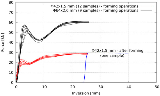The results of typical compression tests plotted in Figure 6 show the force-shortening history in forming and post forming operations (inversion). Under service condition, the steady forces, , of the external inversion mechanism are typically constant and the after-forming force–displacement curve assumes an almost elastic perfectly plastic shape (see the case of the sample in Figure 6).