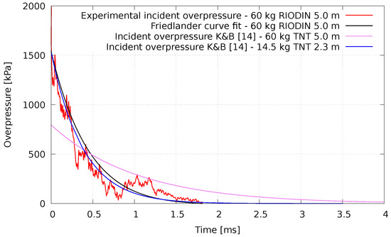 Furthermore, as only the incident overpressure time history was recorded, the reflected pressures were estimated using an equivalent TNT blast load obtained by trial and error. For example, as illustrated in Figure 8, the amount of TNT exploding at ground level that produces an equivalent pressure profile to the 60 kg RIODIN explosive is 14.5 kg at 2.3 m standoff distance. This equivalent curve allows to identify the complete set of parameters that are used in the Kingery and Bulmash polynomial expressions adopted by UFC-3-340-02 [14] to characterize the reflected pressures.