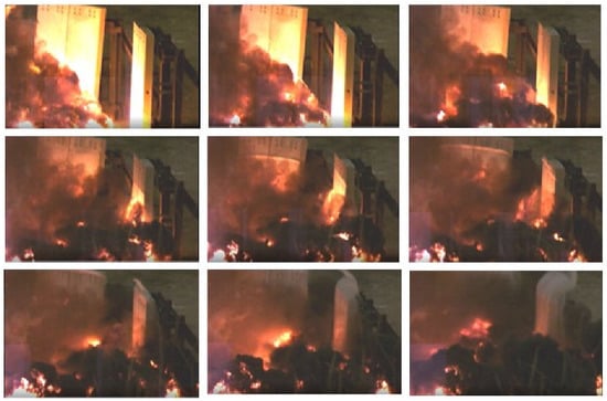The footages from the high-speed camera (recorded at a rate of 30,000 frames per second) presented in Figure 9 illustrate the propagation of the blast wave and clearly show the non-planar shape of the pressure wave starting to impinge the wall from the bottom to the top. This creates a differential (and decreasing) pressure profile along the height of the panels that influences the overall behavior of the system, being expected a higher response at the bottom connectors. Another finding is that for the same weight of TNT (60 kg) the Kingery and Bulmash predictions [14] are quite different from the experimental records. Peak overpressures are significantly higher than expected, but the duration of the positive phase is significantly lower.