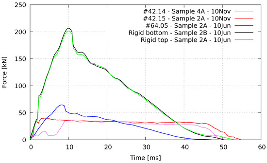 As mentioned before, several force sensors were placed in strategic locations to monitor the forces transmitted to the supports. At least one measurement per EAC type was achieved. These records, plotted in Figure 15, clearly show a reduction in the forces transmitted to the protected structure due to the introduction of the energy absorbing devices.