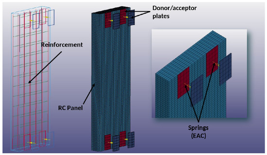 The façade cladding panel is a RC element of m. The panel is connected to the main structure through four EACs located at the corners, resulting in a free span of 2.45 m. Mesh sensitivity and material constitutive models were optimized and selected as described in [12]. The mesh size was selected based on a sensitivity analysis, performed for a blast load of 10 kg TNT at 5 m, and using parallelepiped elements as recommended in [17] for similar analysis. The difference in the simulated maximum displacements at the midspan between the two finest grids was less than 3%, which, according to [18], is a guarantee of good mesh refinement. Balancing the requested computational effort and the accuracy of the estimates, the numerical simulations were performed using 19,016 solid elements with a size of mm (see Figure 16).