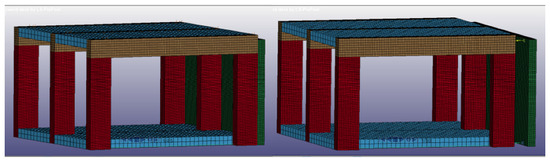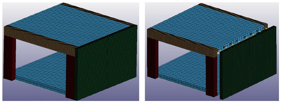 The third scenario is meant to study one of the main issues that structures face under near-field blast loading, which is to avoid or reduce the outer sacrificial panel transmitting energy to the supporting elements by contact. An analysis on the performance of the system under extreme loading is performed, comparing the response of the structure with and without a protective system. For that purpose, a new bay of columns is inserted between the existing two, as illustrated in Figure 18. This model comprises 207,756 elements and 269,767 nodes and takes about 5 h and 20 min to complete the simulation for 120 ms. A blast load of 150 kg TNT equivalent at ground level is located at 2.5 m of the structure and aligned with the central column.