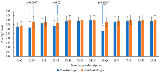 Figure 2. Average scores of descriptors of soundscape evaluations between tourism and residential historical blocks (* p < 0.05, ** p < 0.01).