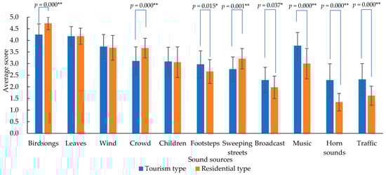 Figure 3. Average scores of preferences of sound sources between tourism and residential historical blocks (* p < 0.05, ** p < 0.01).