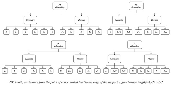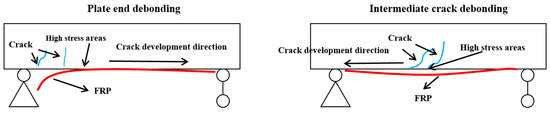 In recent years, deformation and strengthening of structures have been widely studied [1,2,3,4]; fiber-reinforced polymers (FRP) have been widely used to strengthen structures [5]. However, due to the linear elasticity of the material, debonding failure occurs in FRP-strengthened reinforced concrete (RC) beams before the FRP has reached its full performance, which largely limits its further application. [6,7,8,9,10]. PE and IC debonding are the two failure modes for FRP-strengthened RC beams (Figure 1). Generally, IC debonding occurs in beams with a relatively large shear-span-to-depth ratio, while for beams with a relatively small shear-span-to-depth ratio, since the bending moment is minor at this time, the beams are mainly subjected to shear strength, so PE debonding occurs [6]. Nevertheless, due to the complex mechanism of debonding failure of FRP-strengthened RC beams in flexure, it is not realistic to judge the failure modes in strengthened beams merely by shear-span-to-depth ratio [11,12].