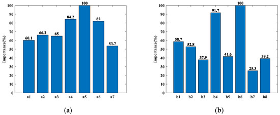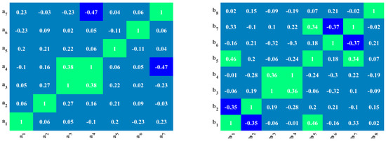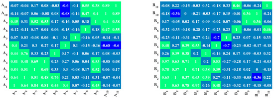 In Figure 3, A1 to A11 are L, b, h, Lf, bf, tf, f’c, ρsv, fy, Ef, fpy; B1 to B11 are L, b, h, Lf, bf, tf, f’c, ρsv, fy, Ef, ρs. It can be seen from Figure 3 that there is a significant correlation between A1 and A2, A3, A4, a significant correlation between A2 and A3, A5, a significant correlation between A3 and A2, A4, A9, a significant correlation between A4 and A1, A3, A9, a significant correlation between A5 and A2, a significant correlation between A6 and A10, A11, a significant correlation between A8 and A11, a significant correlation between A9 and A3, A4, a significant correlation between A10 and A6, and a significant correlation between A11 and A6. Additionally, there is a significant correlation between B1 and B2, B3, and B4, a significant correlation between B2 and B1 and B4, a significant correlation between B3 and B1 and B4, a significant correlation between B4 and B1, B2, B3, and B6, and a significant correlation between B6 and B7. In summary, the correlations among the independent indicators of PE failure are complicated, and most have significant correlations; the relationships among some indicators of IC failure are complicated and cannot be eliminated; therefore, mixed indicators are considered in establishing the indicator system. The correlation analysis results of the mixed indicators are shown in Figure 4.