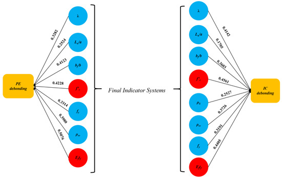 Based on the relevant codes and experimental studies [6,7,8,10,11,12,25,26,27,28,29,30,31,32], in the primary indicator system, according to the literature [18,19,20,21,22,23,24], as shown in Figure 2, independent indicators and mixed indicators systems are constructed, respectively. Among them, the mixed indicator is a linear combination of independent indicators. The combination principle is based on the codes and related literature [16,17,18,19,20,21,22,23,24]. In contrast, the independent indicator system is the physical composition of the study object itself, including the geometric and material properties of the reinforced material itself and the geometric and material properties of the reinforced material.