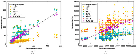 These models for predicting PE and IC debonding have facilitated the study of the debonding failure of FRP-strengthened RC beams. Still, they have significant coefficients of variation between the calculated and experimental values [21,29]. Therefore, it is necessary to conduct a deeper study on debonding failure to establish more accurate models for predicting PE and IC debonding. In recent years, machine learning has been widely used in structural engineering [30,31,32]. In this paper, a data-driven model was adopted, which reduces the cost of experiments and is scientific in the selection of indicators; 229 beams with debonding failure were collected as a database, of which 128 were PE debonding and 101 were IC debonding. Correlation analysis and grey correlation analysis were used to establish the indicator systems for predicting PE and IC debonding and to identify the important indicators among them. Five machine learning models, linear regression, ridge regression, decision trees, random forests, and BP neural networks, were used to build the two debonding prediction models. Optimization of the best prediction among the five machine learning models took place using the Dung Beetle Optimizer (DBO). Finally, the optimal prediction model was compared with the models suggested by codes.
