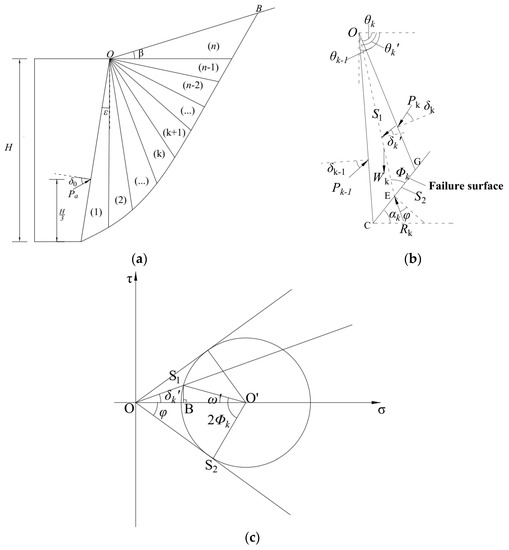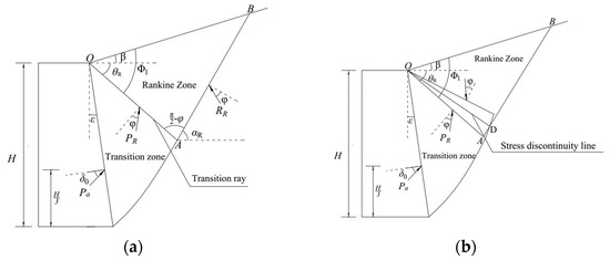 Figure 1 shows a typical stress system of a retaining wall in an active case. The potential failure zone can be divided into the Rankine zone and the transition zone according to the soil plasticity theory. If there is no stress discontinuity, the line OA is the transition ray between the two zones, and it is a slip line, as shown in